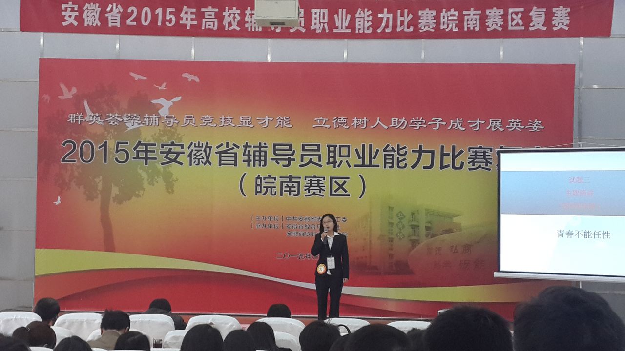 3月20日至22日,安徽省2015年高校辅导员职业能力比赛皖南赛区复赛在安徽商贸职业技术学院举行。我校参赛选手纺服学院辅导员洪飞和管理学院辅导员赵静云表现优异,成功晋级安徽省决赛。