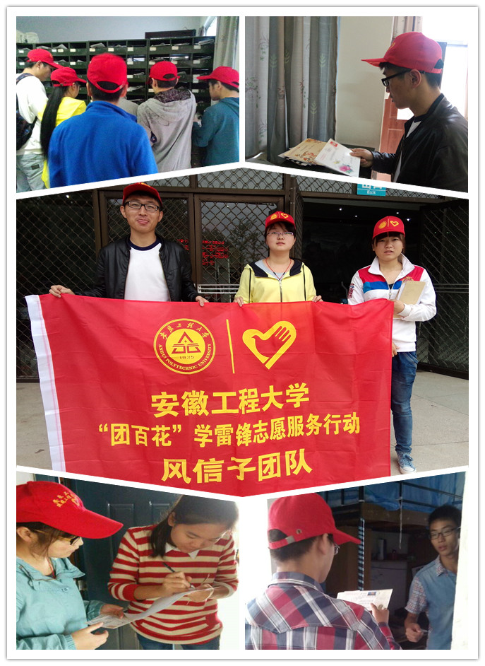 “同学,你好!请问这是你的信件吗?”“是的,这封信我等了好长时间了,谢谢你帮我找到!”这是“风信子”温情送信服务团队在工作中的一幕。为了服务我校广大师生及芜湖市民,让大家能够及时找回遗落的书信,“风信子”温情送信团队长期在学校和芜湖市鸠江区范围内开展送信回家志愿服务活动。该团队主动到校收发室、邮政局,将收件人不明、地址不详的的信件分拣并选派专人主动送到同学寝室或社区居民家中。活动不仅增进了同学之间的友谊,搭建了人与人之间沟通的桥梁,而且有利于和谐校园、和谐社会的建设。