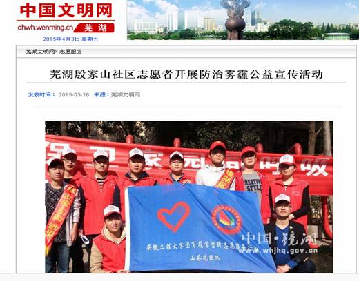 “山茶花”志愿服务团队由应化133班团支部近40名团员组成,自2013年9月成立以来,定期开展专题性志愿服务活动。本次的“雾霾知识宣讲”项目三月初在“和美芜湖”2015年大学生志愿服务项目大赛中荣获铜奖,首战告捷的殷家山社区活动的顺利开展只是开始,该团队后期还打算在芜湖市选择3-5个社区进行“雾霾知识大宣讲”活动,为广大市民普及雾霾知识,提高环保意识。
