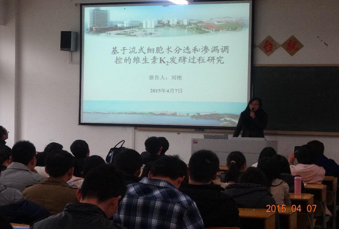 刘艳博士报告的题目为《基于流式细胞术分选和渗漏调控的维生素K2发酵过程研究》,报告阐述了维生素K2发酵法制备的研究背景、国内外研究现状以及发酵法制备的两个瓶颈问题,针对解决这两个瓶颈问题的关键技术—流式细胞术和渗漏发酵进行了着重讲解,提出了其作用原理和体系控制的研究方法、研究思路和研究结果。