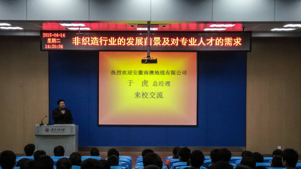 4月14日下午,纺织服装学院在五教117教室组织开展“企业家导学”报告会,邀请安徽南澳地毯有限公司于虎总经理作了“非织造行业发展前景及对专业人才的需求”主题报告。纺织服装学院非织造材料与工程、纺织工程专业200多名本科生,研究生以及部分专业教师聆听了报告会。报告会由学院党委副书记孙宏义主持。