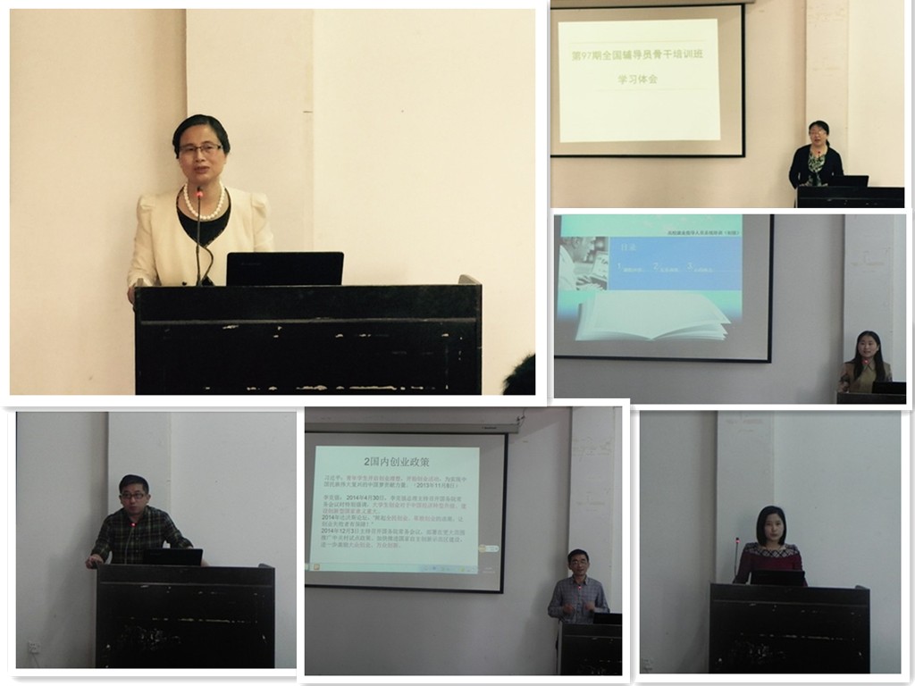 会上,人文学院党委副书记章靖平分享了参加全国辅导员骨干培训班的学习体会,就培训主题“辅导员职业能力提升”的相关内容作了介绍。计算机与信息学院辅导员刘畅从课程内容、实务训练和心得体会三个方面,汇报了参加全国高校就业指导人员系统培训班的学习收获。建筑工程学院党委副书记李烨和机械与汽车工程学院团委书记黄炜,分别从各自的角度谈及了参加全国创业培训(IYB)师资培训班学习感悟。管理工程学院辅导员赵静云细述了参加安徽省辅导员职业能力大赛的参赛收获和启发。