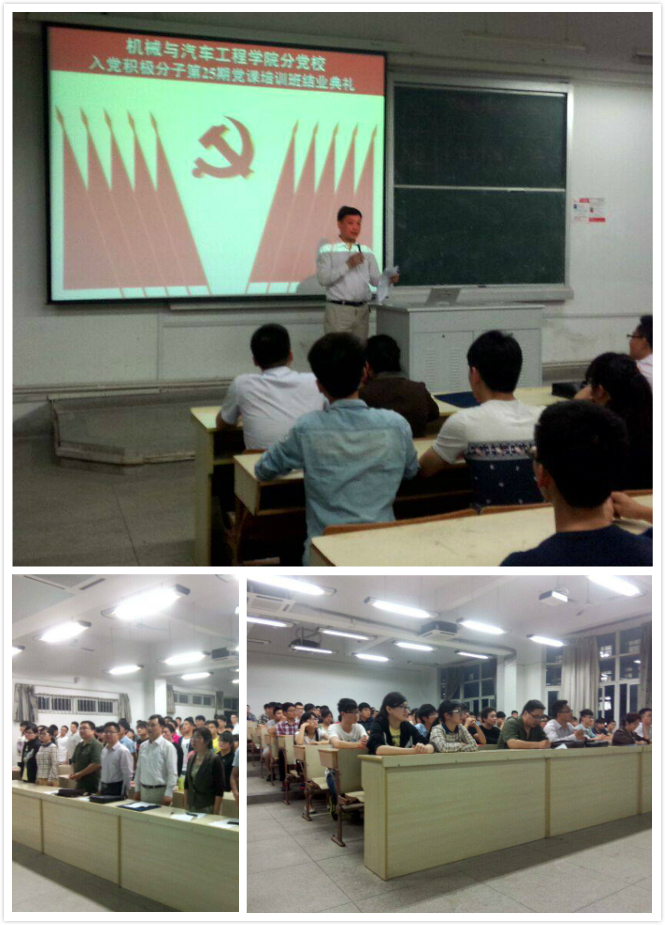 结业典礼在庄严的国歌声中拉开序幕。周怡首先宣读《关于机械与汽车工程学院分党校第二十五期入党积极分子党课教育培训班结业的通知》,本期党校共招收145名学员,其中141名学员经过严格考试和考核按期结业,并评选出22名优秀学员。优秀学员代表尤传存在发言中表示,结业以后将继续认真学习党的知识,将所学的理论运用到实践当中,积极工作,以优异的成绩争取早日加入党组织。
