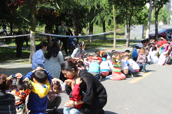 9时30分,警报信号发出,各班幼儿在教师的带领下,沿着演练方案中事先预定的线路迅速而有序地从各个教室往外疏散。幼儿园的教师和后勤人员积极保护幼儿,指导幼儿双手抱头、低头看路,有秩序地快步撤离。有的小朋友紧张得哭了起来,教师便抱着他一边安抚,一边疏散;有的小朋友鞋子跑掉了,保卫处工作人员抱起他继续组织疏散。全体人员很快就到达园外安全地带。参加本次防灾演练的全园师生共计175人,整个过程用时一分半钟。