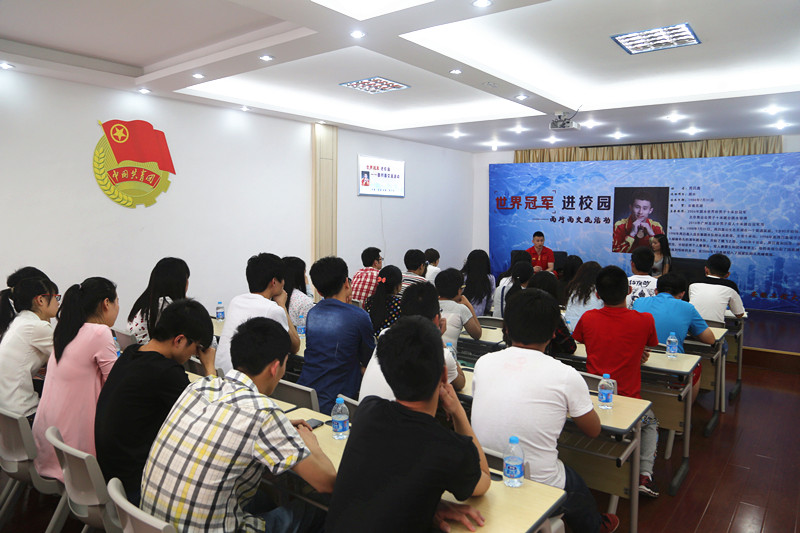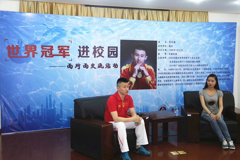 5月13日下午,校团委在师生活动中心举办“世界冠军进校园”面对面交流活动。2006年跳水世界杯男子十米台冠军、北京奥运会男子十米跳台银牌、广州亚运会男子双人十米跳台冠军、芜湖籍跳水运动员周吕鑫受邀来到我校与学生进行面对面交流。校党委副书记苏国红出席,校团委、学生处负责人及40名学生代表参加了活动。