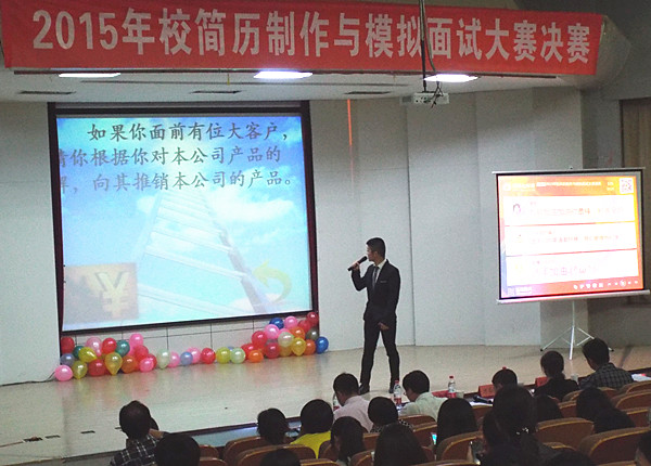 5月13日晚,2015年校简历制作及模拟面试大赛决赛在学术报告厅举行。国家首席职业指导师、校工会主席王河,管理工程学院工商管理系主任谢荣见,安徽华亿集团华亿乐购网络科技、安徽中亿乐居房地产营销有限公司综合管理部经理陈海鹏,中国企业500强、芜湖美的制冷设备有限公司管理部人事经理赵飞娟,校就业指导科科长李恒奎应邀担任决赛评委。校学生处处长张开炳,省大学生职业素养培育辅导员名师工作室有关成员参加了活动。