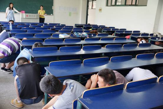 本次演练分为地震知识普及、就地避震、逃生演练三个环节。演练开始前,查桂义介绍了防震减灾知识、本次演练的步骤及注意事项,强调了演练的重要性。就地避震演练环节中,同学们在第一次警报响起时就立即把自己的身体特别是头部藏在桌子下,并且用手或者书包保护好头部。第一次震动结束,第二次警报响起时,进入逃生演练环节,在工作人员的引导下,学生们紧捂口鼻、飞快且有序的穿过弥漫着硝烟的楼道,疏散到教学楼前安全地带。