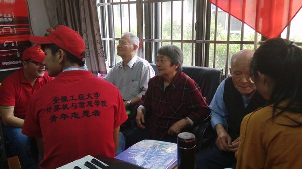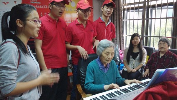 上午八点三十分,二十余名志愿者刚走进赭山敬老院,就受到了老人们的热烈欢迎。经过队长简单的分配,同学们两到三人为一组陪老人聊天,倾听老人诉说自己的家庭子女和往年趣事。看到老人提及自己儿女时流露出来的骄傲神情和绽放的幸福笑容,志愿者们也被浓浓的亲情所感动。接着,志愿者在活动室为老人们表演了精心准备的节目,其中精彩的黄梅戏赢得了满堂喝彩,而双方合唱的《让我们荡起双桨》,伴着老人的电子琴即兴伴奏,让大家共同回忆起建国初老人们的少年幸福时光。在一片欢声笑语中,志愿者活动圆满结束。