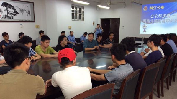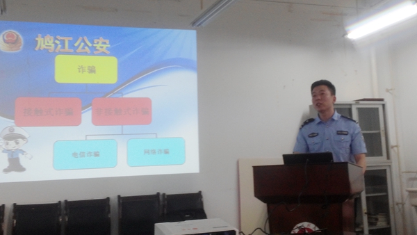 5月25日下午,市公安局鸠江分局来我校开展“电信诈骗防范”讲座。讲座由芜湖市公安局鸠江分局综合室主任王博主讲,城东新区派出所副所长杨庆、社区警务队指导员傅强、我校社区民警余毅一行到现场与师生交流,计算机与信息学院部分学生聆听了讲座,讲座由学院党委书记邬海量主持。