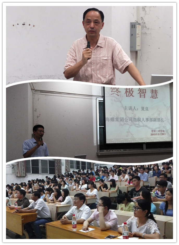 5月28日晚,应管理工程学院邀请,安徽海螺集团有限责任公司组织人事部副部长夏良在二教报告厅为学院学生作题为“终极智慧”的报告。报告会由院党委书记汪张林主持,工商管理系主任谢荣见及部分教师参加了报告会。