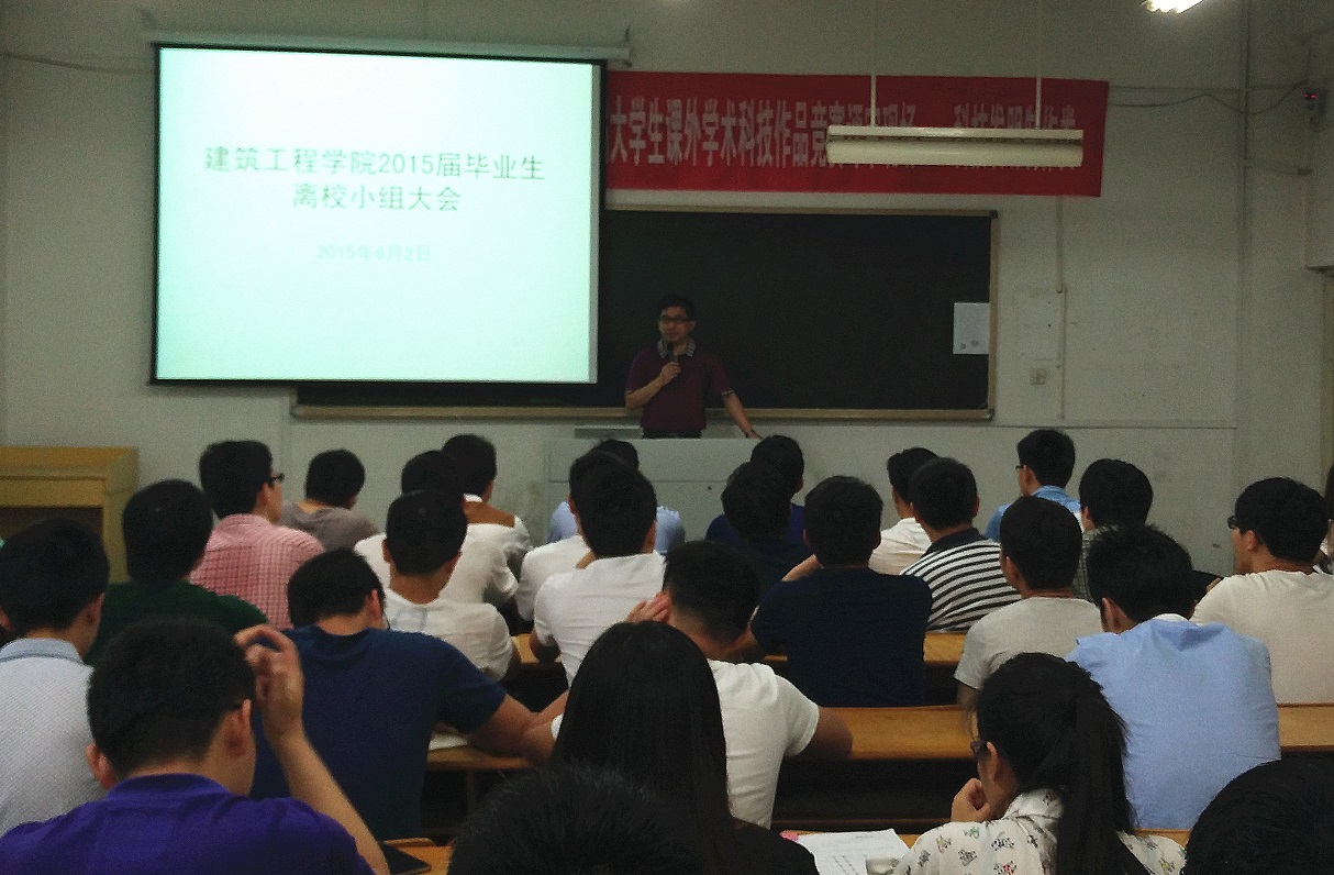 为扎实做好2015届毕业生离校工作,促进毕业生离校前各项工作文明、规范、有序、健康地开展,6月2日上午,建筑工程学院在4教107教室召开学院2015届毕业生离校工作小组会议。学院党委副书记李烨出席,毕业班辅导员,各班级离校工作小组成员,共计80余人参加会议。会议由院团委副书记刘海涛主持。