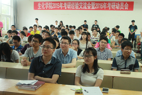 6月8日下午,生化学院在2教106举办了2015年考研经验交流会暨2016年考研动员会。2015届顺利考取研究生的部分同学在临近毕业之前,毫无保留的将自己的考研心得和体会一起分享给了2016届备战考研的学弟学妹们。