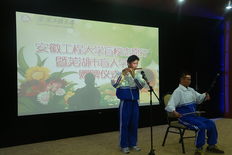 仪式上,芜湖市盲人学校和我校大学生艺术团的学生分别进行了文艺表演。仪式结束后,我校志愿者带领盲校的师生们参观了校园,并进行了全程讲解。
