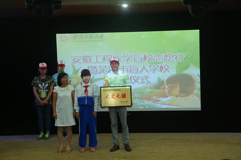 6月7日上午,我校与芜湖市盲人学校开展的志愿服务联谊活动暨芜湖市盲人学校赠牌仪式在工会活动室举行。校党委副书记苏国红出席活动并对芜湖市盲人学校师生来校参观交流表示欢迎,校团委负责人及150名志愿者代表参加了活动。