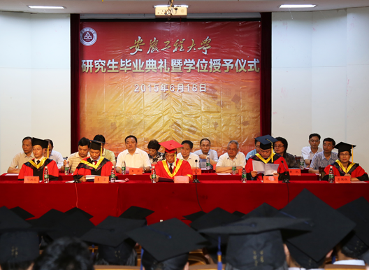 毕业典礼在庄严的国歌声中开始。李震首先宣读学校授予2015届研究生硕士学位的决定。随后,校领导给获得硕士学位的同学颁发学位证书并扶正流苏。副校长叶常林宣读学校2015届优秀硕士学位论文评选结果、2015年安徽省品学兼优毕业生表彰文件、2015年校级优秀毕业生表彰文件。学校领导为2015届优秀硕士学位论文获得者、安徽省品学兼优毕业生、校级优秀毕业生颁发荣誉证书。导师代表时培成教授和毕业生代表承梓惠同学在毕业典礼上作了发言。
