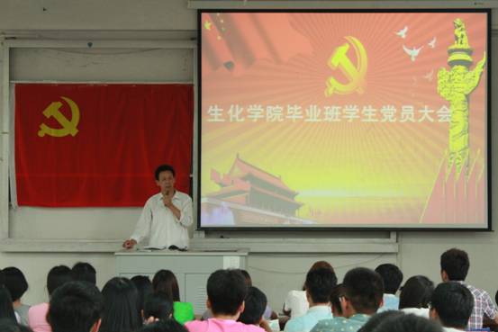 在2015届毕业生离校前夕,根据学校《关于在2015届毕业生党员中开展主题教育活动的通知》精神,6月18日下午,生化学院在2教107举行了全体学生党员入党宣誓暨毕业生党员大会。学院党委副书记章兵出席,各学生党支部书记和学院全体党员参加。会议由团委副书记胡云主持。