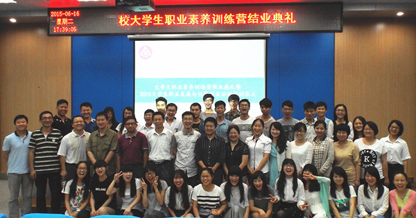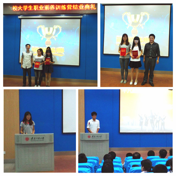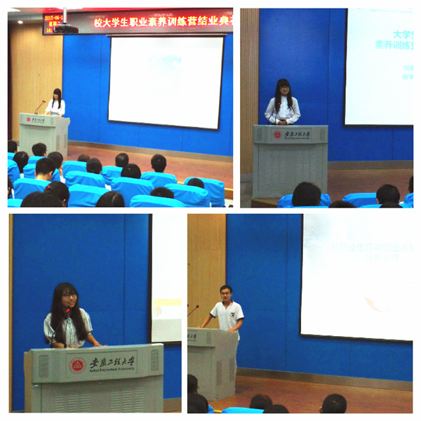 6月16日下午,校大学生职业素养训练营结业典礼暨2015年大学生职业发展与创新创业活动节闭幕式隆重举行。校学生处处长张开炳、校团委书记刘一、机械学院党委副书记周怡、生化学院党委副书记章兵、建工学院党委副书记李烨、安徽省大学生职业素养培育辅导员名师工作室全体成员参加了活动。