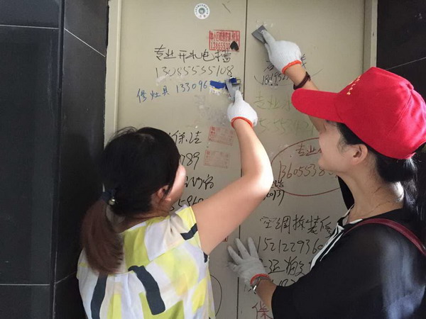 上午8时许,学院9名教工党员志愿者一起来到了海南渡社区,与社区志愿者一起参加志愿服务活动。海南渡社区很多居民楼的外墙和楼道内墙面上贴满了小广告。党员志愿者们一到小区,就拿着工具干了起来,大家有的往墙上喷水,有的用铲子铲小广告,有的清扫道路两旁垃圾,有的清除绿化区内的杂草。经过党员们的努力,社区卫生死角得到了有效清理,居民群众们也对他们投来了赞许的目光。