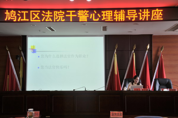 法院干警白天上班审理案件,晚上加班制作文书,经常夜晚做梦都是案情分析,日常生活常被案件困扰。随着立案登记制度的实施,法院干警的工作压力越来越大,容易产生职业倦怠感,处于身心“亚健康”状态。金艾裙结合法院工作实际,系统讲授了职业倦怠的类型、法官常见的心理问题、压力的来源及应对等知识,在与法院干警互动分享职业倦怠一般调适方法的同时,着重从积极心理学视角,鼓励干警们通过积极的思维方式、积极的情绪体验、积极的社会支持来自我调适、自我完善。