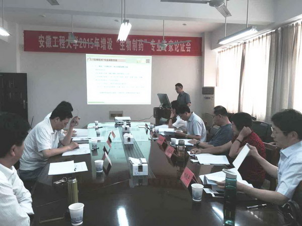 7月5日,教务处、生化学院邀请中国科技大学药物工程中心常务副主任、安徽省生物工程学会理事长肖卫华教授,安徽农业大学生命科学学院常务副院长蔡永萍教授,安徽大学健康科学研究院副院长杨兴元教授,安徽安科生物股份有限公司技术总监王荣海研究员,皖南医学院药学院院长刘晓平教授,以及安徽工程大学教务处处长陶庭先教授和生化学院院长徐建平教授等校内外专家对我校增设生物制药专业进行专业论证。