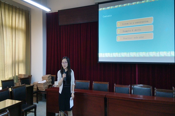 大学英语教学一部承担了2014级学生的大学英语教学改革试点教学,教学总结和教学演示汇报分别由该教学部四个模块教学组教师代表共同完成。每组代表首先对本课程模块组上学期开展的教学活动用PPT进行系统介绍,包括课程目标、教学内容、教学方法及手段、课程测评、教学效果、学生反馈、存在的问题、经验教训及建议等;接着每个模块课程教师代表现场演示教学片段,展示教学过程。每场观摩教学结束后,设立了互动环节,教师们就教学汇报内容积极提问并展开讨论,气氛热烈,达到了本次活动的预期效果。