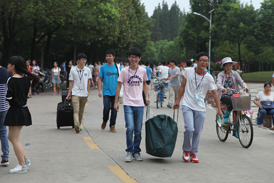 终于踏进了大学的校门,志愿者们簇拥向前,帮学弟学妹们提行李,为学弟学妹们介绍校园……一路上说说笑笑。