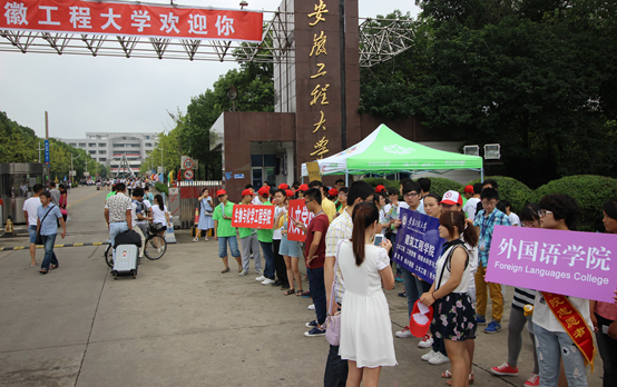 简短的校车旅程后,新生们终于抵达了今天的目的地——安徽工程大学。校门口各学院志愿者纷纷置牌驻立,第一时间迎接自己学院的新生。