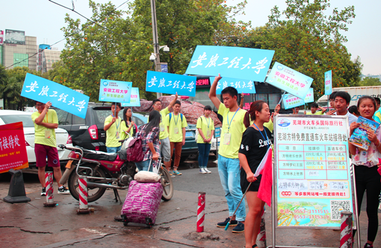一大清早,志愿者们便来到车站等待新生。他们手举“安徽工程大学”的牌子,站在最显眼的位置,以便新生能够快速在人群中找到志愿者们。