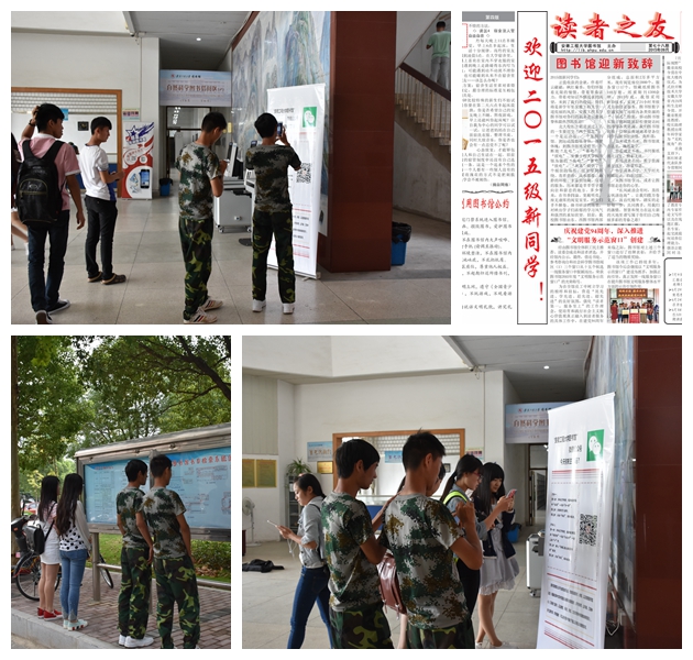 图书馆作为学校的文献信息中心,是求知探索的殿堂。为使新生们在短时间内了解图书馆的资源和服务,图书馆组织了一系列的活动:举办新生读者入馆教育培训讲座;向每位新生发放《读者指南》;制作精美的宣传栏;印发内容丰富的图书馆馆刊《读者之友》;开通新生读者借阅权限;在东西两馆摆放宣传图书馆微信服务平台和移动图书馆的展板;发放各种宣传彩页等。