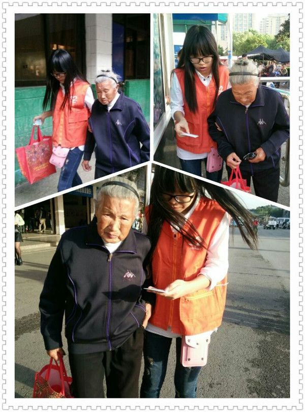 10月1日,芜湖火车站迎来客流高峰,精神饱满的志愿者们早早赶到火车站。当时,志愿者王同学正在火车站的售票大厅站岗,两名女孩扶一位年过花甲的老奶奶来到身穿黄色马甲的王同学面前,王同学见此情景,立即接过老奶奶,俯身侧耳仔细询问老奶奶。老奶奶年纪大了,眼睛不好使,又不识字,她不清楚亲戚买的票是什么时间,更不知道怎么去车站里面。王同学了解情况后,立即带领这位老奶奶,从进站口检票,在安检口处将这位老奶奶的相关情况告知火车站工作人员,并且一路搀扶老奶奶来到软席候车室,让老奶奶休息。王同学不放心老奶奶一人上火车,于是在火车到来之前,又再次来到软席候车室,护送老奶奶上火车。老奶奶对王同学这种服务精神与认真态度十分感激,并不断致谢。