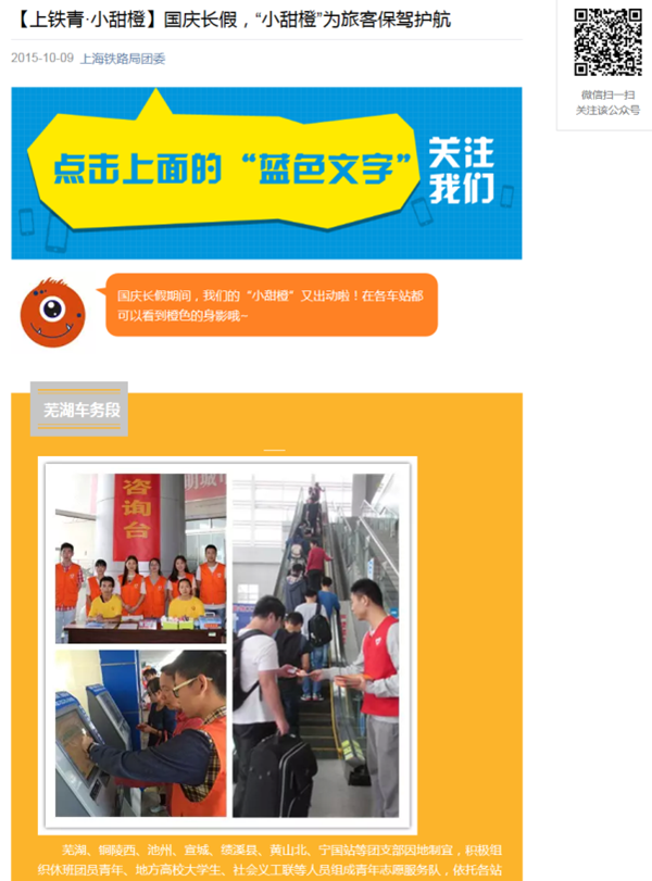 10月9日,上海铁路局团委官方微信以“国庆长假,‘小甜橙’为旅客保驾护航”为题,报道了我校“暖途”青年志愿者国庆节志愿服务活动。
