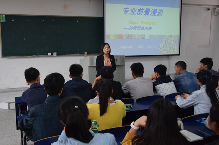 为帮助2015级新生全面了解英语和日语专业前景,更好地塑造未来,10月10日下午,外国语学院在6教313举办了专业前景介绍专场讲座。本次讲座由外国语学院院长刘进教授亲自主讲,院团委副书记余本祺主持,学院2015级全体学生和部分高年级学生聆听了此次讲座。