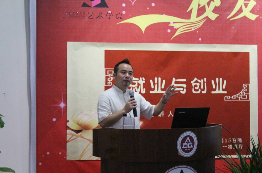 10月15日晚,艺术学院邀请2001届校友、上海悦玺文化发展有限公司董事长胡先水,在7教设计艺术馆作“就业与创业”校友论坛报告会。艺术学院院长黄凯、院团委副书记迟传德、台北科技大学教授鲍达芃、上海悦玺文化发展有限公司执行总监李琪、重庆天农八部执行长王维诚及我院部分新生聆听报告。迟传德主持报告会,他介绍了胡先水的创业情况并对他回母校做报告表示欢迎和感谢。