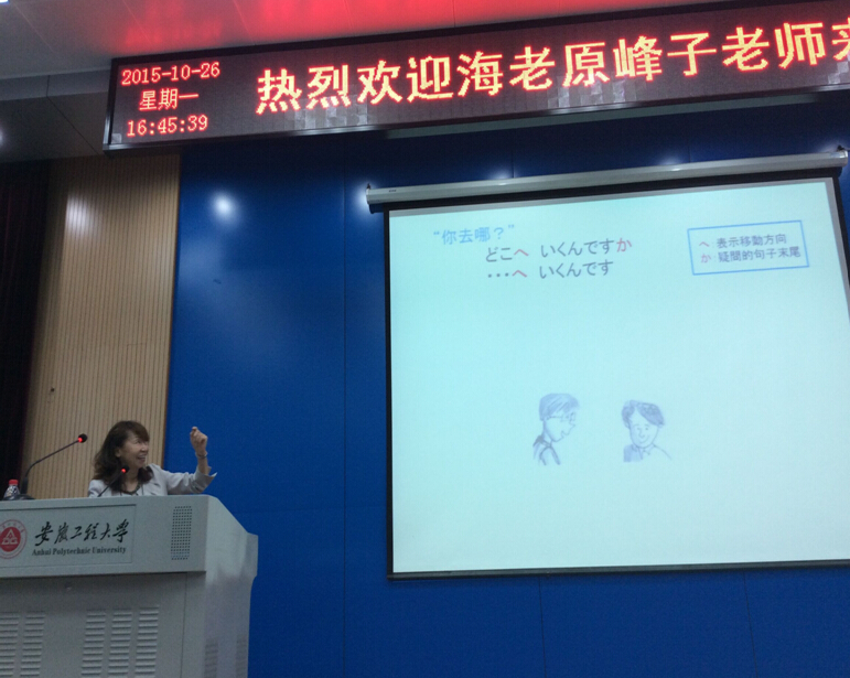 10月26日,应我校外国语学院邀请,日本国际教育学术交流协会理事、日本语教育专家海老原峰子女士为我校作了主题为“动词活用整体导入学习法”的学术讲座,并与日语系师生进行了交流。外国语学院领导、日语系全体教师、各年级学生以及部分日语爱好者120余人参加了讲座。