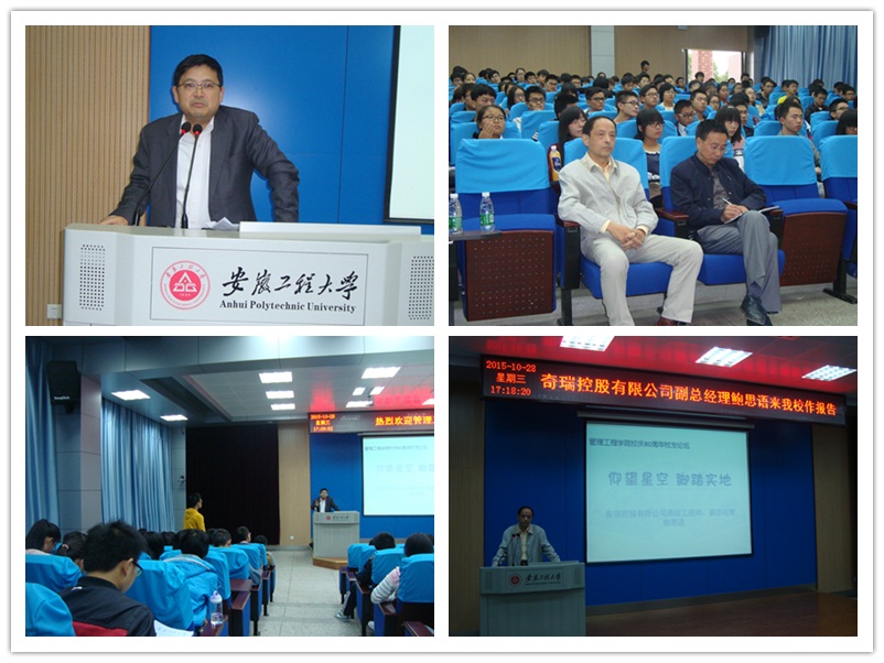 10月28日下午,管理工程学院邀请质量管理专业99届校友、奇瑞控股有限公司副总经理鲍思语在5教117室作了题为“仰望星空脚踏实地”的校友论坛报告。学院领导及质量管理、工业、物流等相关专业的200多名学生聆听了报告。报告由学院党委书记汪张林主持。