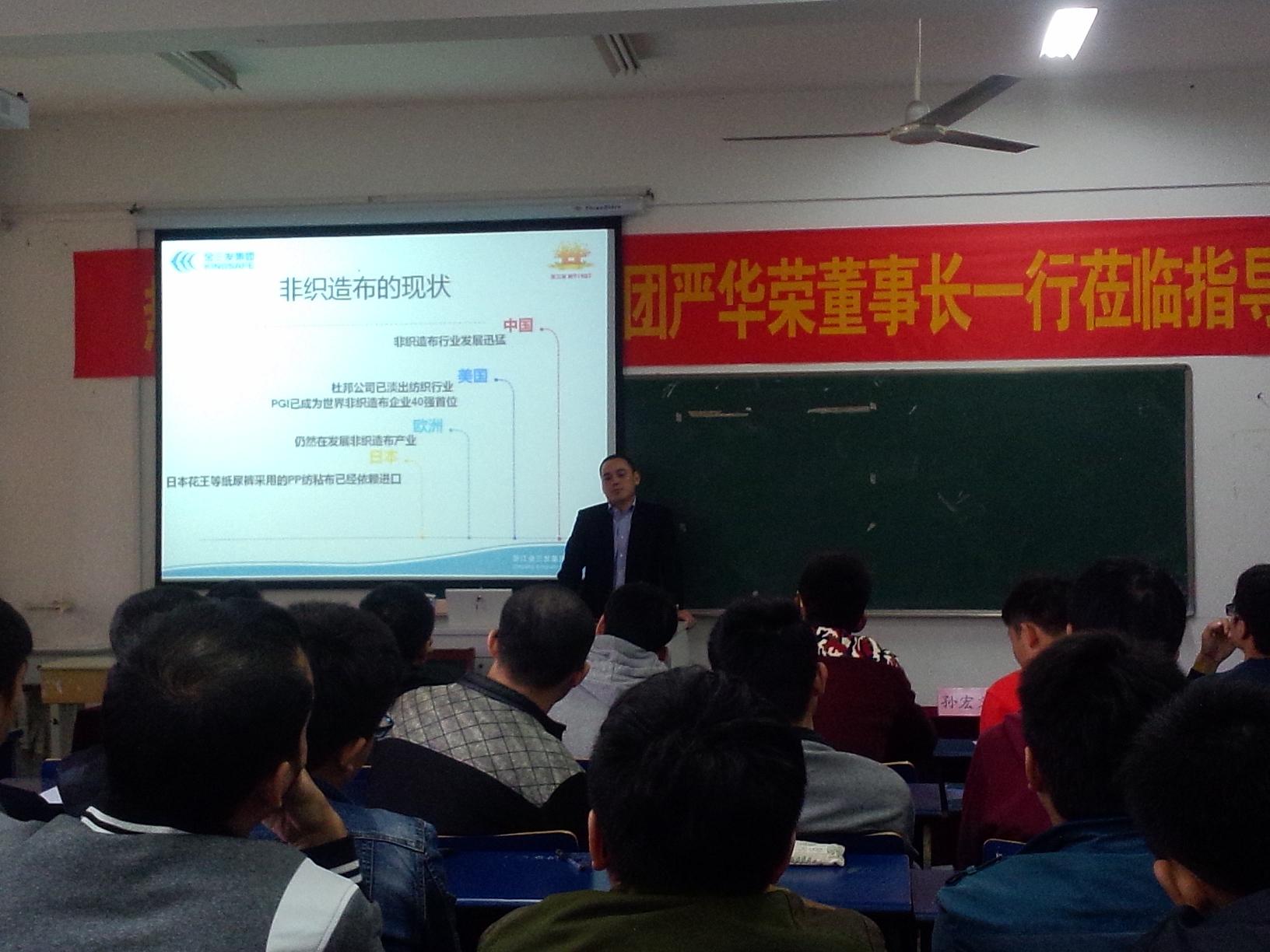 10月28日,浙江金三发集团董事长严华荣应邀到纺织服装学院作了题为《关于非织造布》的报告,非织造材料与工程专业的学生及部分专业教师聆听了报告。
