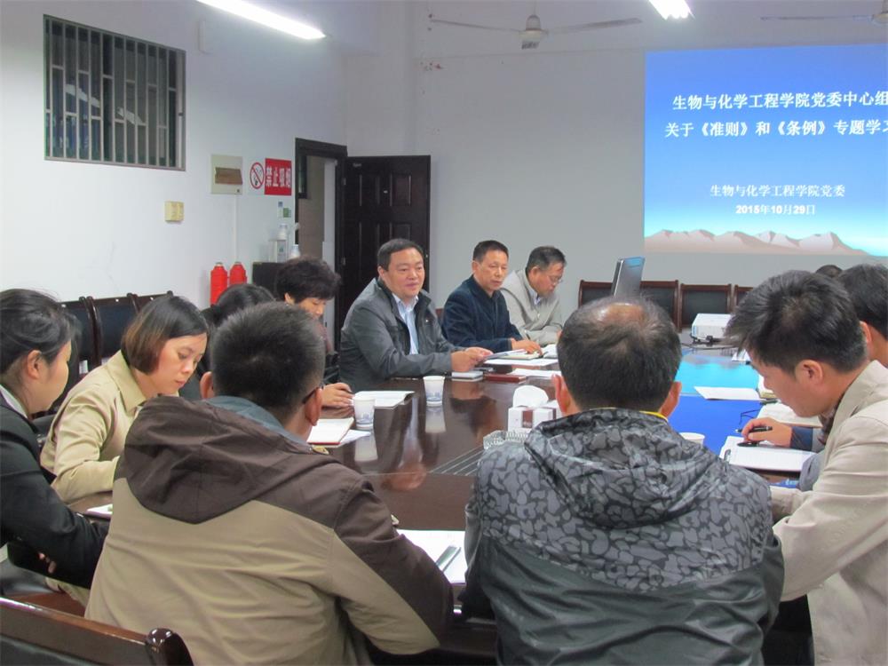 其次,王弘对《准则》和《条例》的内容进行了解读,并结合《生物与化学工程学院关于开展“三型”党支部创建活动的实施方案》,对学习贯彻《准则》和《条例》提出了具体要求:第一,《准则》和《条例》,是党要管党、从严治党的尺子、准绳,向全体党员明确了“什么该做、什么不该做”,为全面从严治党树立道德高线和纪律底线的准则;第二,全体党支部书记要在先行自学的基础上,带领本支部全体党员结合实际情况,深入推动“两项法规”的学习,要把增强学习意识作为贯彻中央精神的重要手段之一常抓不懈;第三,通过学习,全体党员要使廉洁自律规范内化于心、外化于行,要坚持理想信念宗旨“高线”,守住纪律“底线”,永葆共产党人清正廉洁的政治本色。