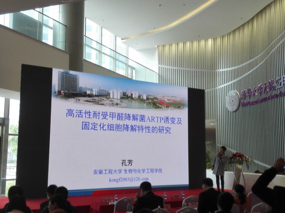 研讨会历时两天,共举办了28场次的专题研讨会。其中,生化学院孔芳博士应邀做了题为“高活性耐受甲醛降解菌ARTP诱变及固定化细胞降解特性的研究”专题报告,深入浅出地介绍了生物法降解甲醛的原理及突变体的诱变选育,引起了与会学者浓厚的兴趣和关注。