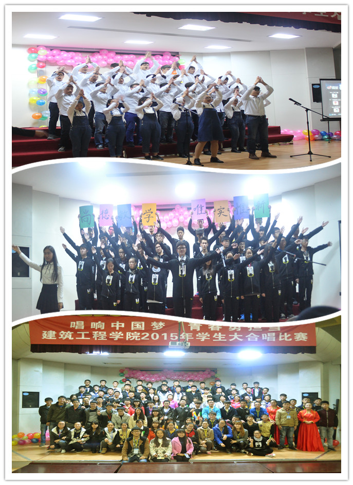 比赛持续90分钟,现场高潮接连不断,最终建筑131班夺得学生大合唱比赛的桂冠。校合唱团团长许庆同学作为点评嘉宾,肯定了各参赛班级的突出表现,手语、阵型变换等比赛创意让人耳目一新。本次比赛以校庆80周年为契机,更加鲜明地将“中国梦”与“青春担当”紧紧相连,展现出建工学子乐观向上、团结合作的优秀品质,增强了参赛班级的集体荣誉感和凝聚力。