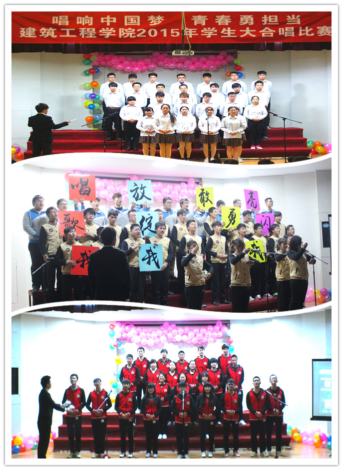 比赛在优美婉转的《贝加尔湖畔》歌声中拉开序幕。经过初赛地激烈角逐,胜出的9个班级汇集一堂,表达自己的中国梦以及青春担当。清风细雨,宁静的夜晚静待着动听的旋律;风采独具,热闹的报告厅奏响着华丽的乐章。给排水153班深情演唱《我的中国心》,以高昂的旋律和对祖国深深的热爱感染在场观众;工程142班《仰望星空》用独特的合唱方式、舒缓的节奏,将对未来的美好遐想和执着追求娓娓道来;土木153班《奇迹再现》唱响后,引爆全场,掌声、欢呼声不绝于耳,将现场气氛推入高潮;土木151班带来的《高飞》以及给排水152班带来的《年轻的战场》用明快的旋律、激情的演绎将观众引进一个拼搏、欢腾不羁的青春殿堂;建筑131班的《青春纪念册》轻灵舒畅的音乐,青春动感的手势,给观众带来丰富的视听享受。