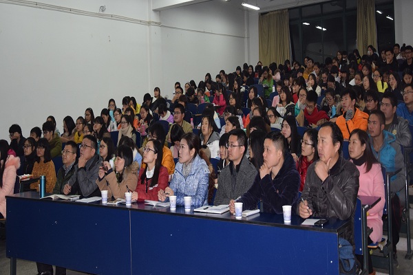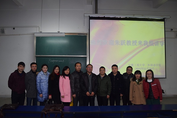 11月30日晚,教育部高等学校英语专业指导委员会委员、安徽大学外国语学院院长、博士生导师朱跃教授应我校外国语学院邀请在6教215作了题为“英语使用与性别”( English and Gender)的学术讲座。讲座由外国语学院副院长黄焰结主持,外国语学院部分教师以及近三百名学生聆听了本次讲座。