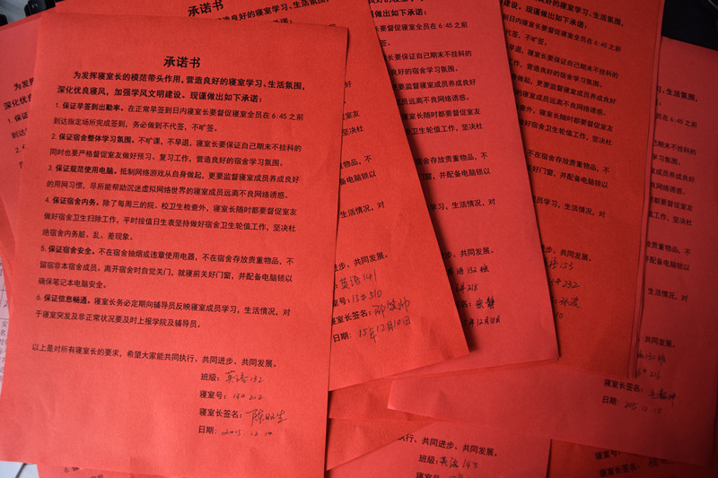 会后,全体寝室长提交了“承诺书”,表示将积极带领室友们做到规范使用电脑,营造学习氛围;早睡早起,拒绝懒觉;勤于内务,拒绝邋遢;信息畅通,保证安全;团结友爱,共同进步。
