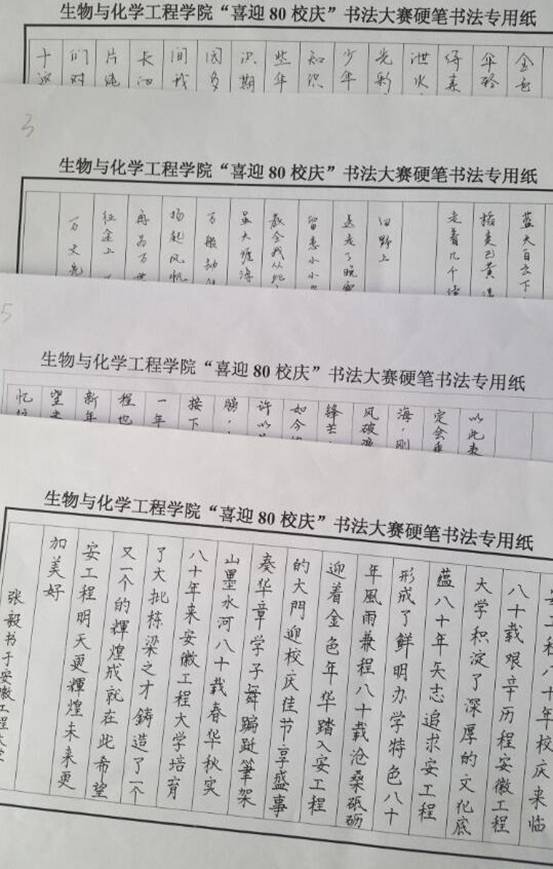 浓厚笔墨,书写横竖撇捺的精彩;隽永话语,赞颂八十余载的辉煌。为庆祝我校建校80周年,生化学院近日举办了“书写八十 点墨华诞”为主题的书法大赛。