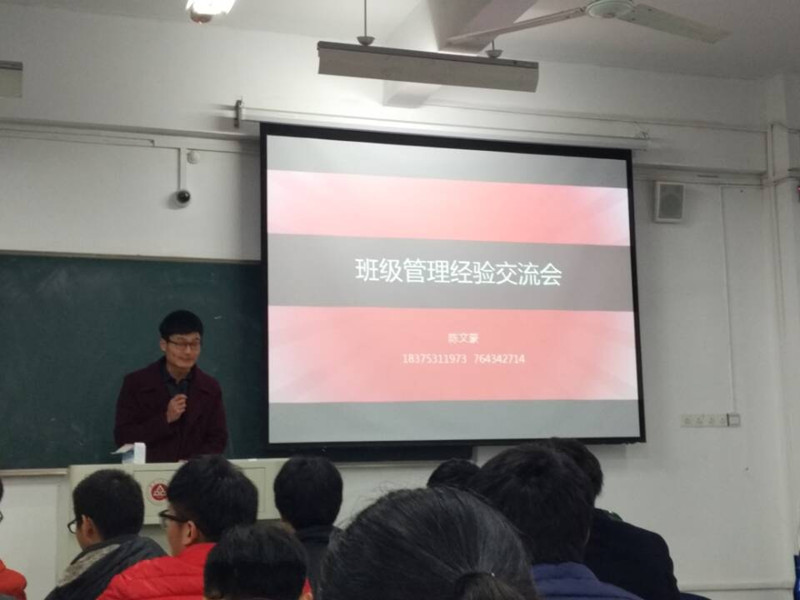 12月9日晚,社工122班长陈文豪在6教109为2015级所有的新生班委带来一场“相互关爱”的经验交流会,现场氛围十分活跃。陈文豪分享了其担任班长期间带领班集体获得的省级、校级以及院级荣誉,并现场播放了其制作的班级纪念视频,讲述班级管理离不开“相互关爱”。学生干部不仅要关爱自我,更要学会关爱他人,关爱同学,学会心理健康自我调适和调适他人。学会感恩,要把感恩当作一种习惯和态度。用心对待每一件事,为他人带来欢乐,为人生创造价值。