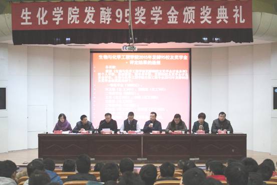 12月28日,在学校八十华诞之际,生化学院举办了2015年“发酵95校友奖学金”颁奖典礼。生化学院副院长陶玉贵、薛正莲和党委副书记章兵出席颁奖典礼,校友代表乔文明、储利民应邀出席了典礼。生物工程专业14、15级全体学生参加典礼。典礼由胡云主持。