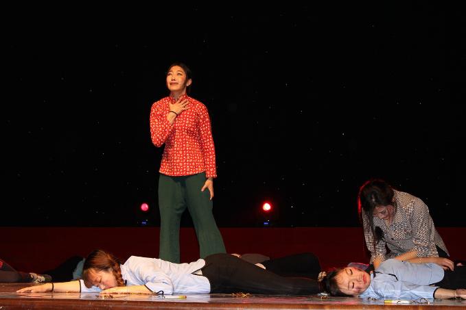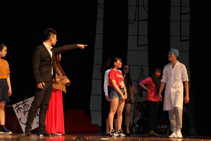 一段激情四射的活力啦啦操表演拉开了本场话剧演出的大幕。《拒绝三手》描述了吸烟这一社会现象对不同家庭的深刻影响;《心愿》则以项我校宁老师和黄丽阳老师西藏支教为背景,描述了两位老师与藏族学生家庭之间的矛盾曲折,艺术再现了支教在西藏建设发展中所发挥的巨大作用以及支教者本人灵魂的升华改变;《整容一条街》则以当前乱象倍出的医学整容为题材,反映了不少人精神世界的浮躁和落寞,呼唤大家追求精神美,远离“蒙你美容院”;《文明之风》则以餐厅中年轻人的喧嚣折射了文明的失语,让在场观众感触良多;最后一幕《中国的男人去哪了》以当前小鲜肉、高富帅和男神欧巴等为关键词,追忆了发生在70多年前发生在中华大地上那场惨绝人寰的大屠杀,呼唤中国的男人站起来,以此纪念中国人民抗日战争胜利70周年。