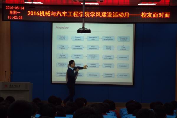 王明通过介绍一系列的企业产品,描述了在产品的设计、生产和售后服务等环节所用到专业知识,用生动的事例告诉同学们在大学期间的基础知识学习的重要性。他说,“学校开设的每一门课都有它的思考,每一个学分都是经过老师们的深思熟虑”,“要珍惜大学宝贵的时光,它是我们一生的基石”。他还给同学们提出了建议,“多去图书馆看看,多去教室自习,积极思考,积极锻炼身体,勇敢的面对自己的梦想,对自己的懒惰说不。”随后的互动提问环节,王明耐心地回答同学们关于大学生活、学习、学业规划和职业发展的提问,赢得了现场阵阵掌声。