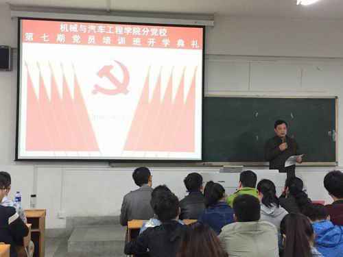 为切实加强对我院大学生党员的教育培养,不断提高学生党员的思想政治素质、理论水平和党性修养,保持党员队伍的先进性和纯洁性,同时加强学习型党组织建设,按照校党校部署,机械与汽车工程学院于4月8日在举行了第七期党员培训班开班典礼。 院党委书记、院分党校校长邓英扣,院党委副书记、分党校副校长周怡,院党委委员、团委书记黄炜,学生党支部书记齐尚晓、陈刚,学生支部副书记、第七期党员培训班班主任吕寅以及全体学员出席了本次典礼。典礼由黄炜主持。