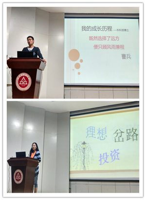 四位博士在报告会上结合自身实际,围绕“我的成长之路”与学生进行了面对面的交流。曹兵博士以一句“谁的青春不迷茫”,引起在坐学生的强烈共鸣,他提出走出迷茫要靠顽强的毅力和坚定的意志,要学会把大的目标分化成若干个切实可行的小目标,分类规划并实现自己的终极目标。杜怡韩博士围绕理想和现实的话题,向大家介绍了自己从本科到博士各阶段的经历,分享了自己怎样从一个迷茫的大学生到成功保研的历程,并就在学习和生活中遇到困难时如何抉择给出了自己的建议。刘世君博士从大学学习和生活中存在的弊病出发,十分诚恳地给大家讲解为什么要上大学、上大学是来干什么等问题,提出大学生应该要有端正的学习态度、正确的价值观,学好基础知识,踏实做好学业,努力提高技能。徐晓平博士分享了自己在美国底特律大学研修期间的所见所闻所感,并在学习和生活独立性,做事的态度和大学生社交礼仪等方面提出自己的希望。报告会现场气氛十分热烈,博士们热情洋溢的话语,赢得同学们的阵阵掌声。