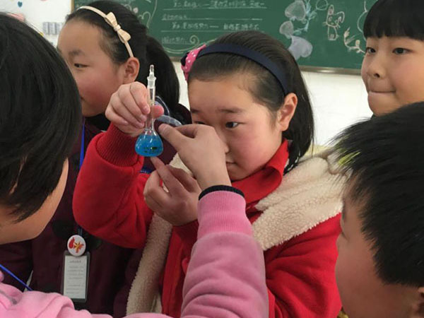 孩子对于未知的世界总是充满好奇的,为抓住小孩的好奇心,飞燕草团队和七色花团队以化学实验为桥梁,对火龙岗中心小学的农民工子女和镜湖新城实验小学进行了关爱。大姐姐和大哥哥们用酸碱变色、醋酸钠溶液结晶、氢氧化铜沉淀等反应实验带领孩子进入化学的奇妙世界,让孩子们感受到变化反应的神奇,也拉进了小孩和志愿者之间的距离。
